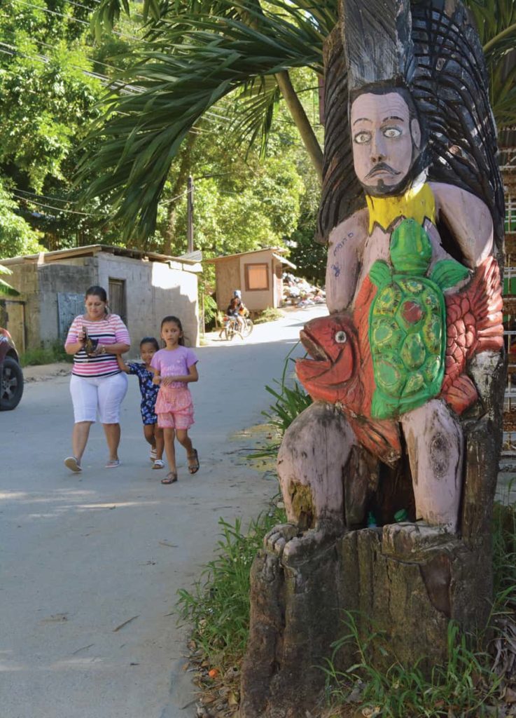 A wood carving adorns the main street of the colinia Policarpo Galindo.