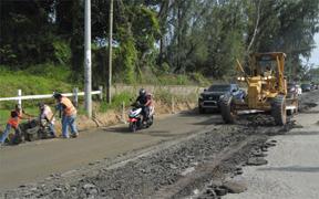 The concrete used for white topping the new roads has 4,500 psi strength and cut into 1.25 meter sections. The rebar was placed at the middle joint. The concrete is then cut into sections 1.25 meters apart. “That distributes the weight of the vehicles more evenly,” says Ing. Isnardi. “This concrete is made for any type of traffic.”